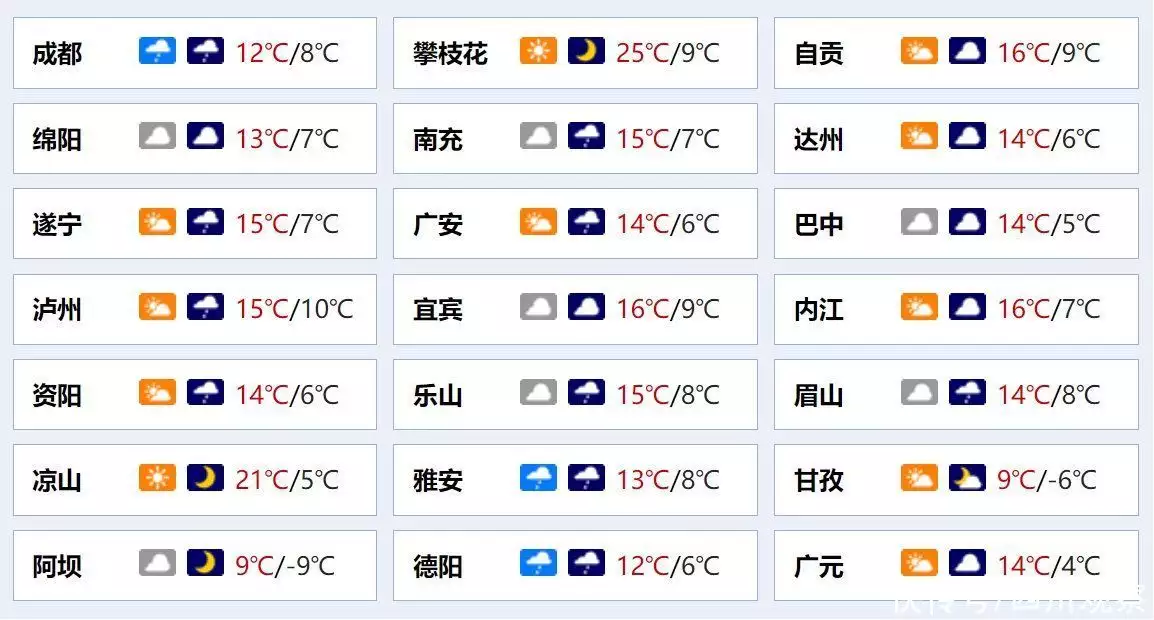 今天白天:盆地各市阴天间多云,其中德阳、成都、雅安、眉山、乐山5市和宜宾、泸州2市南部有小雨或零星小雨;甘孜州东部多云间阴有分散阵雪(雨),川西高原其余地方多云,攀西地区晴间多云。