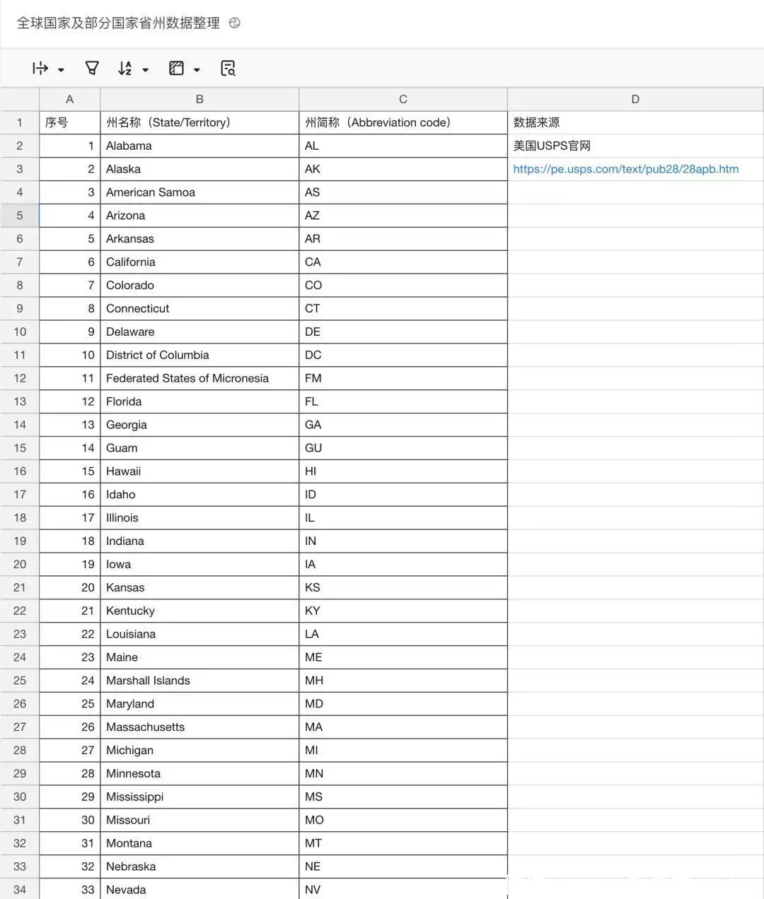 美国的省州数据关系表如果搞不到一些重点国家的省州+城市联动数据,那么可以退而求其次把国家+省州的数据维护好,这样也能提升很多用户体验了一些重点国家+省州的联动数据,我放在了语雀知识库中,感兴趣的朋友可以看这个链接。