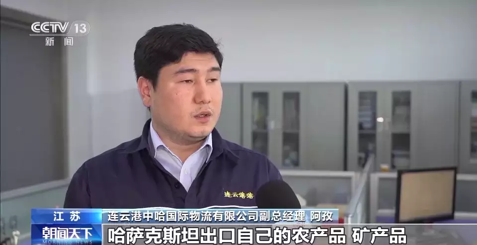 连云港中哈国际物流有限公司副总经理 阿孜:自从有了中哈(连云港)物流合作基地,哈萨克斯坦出口自己的农产品、矿产品变得更方便了同时,东南亚等国的产品也能更快捷地进入哈萨克斯坦共建“一带一路”有利于中哈两国发展。